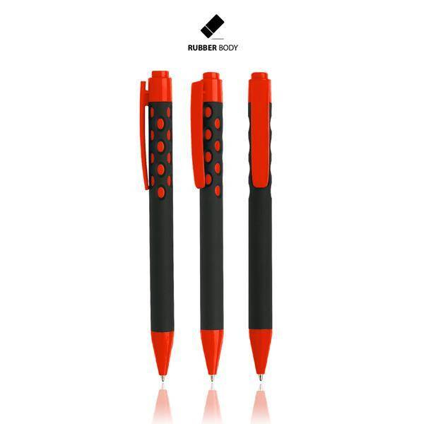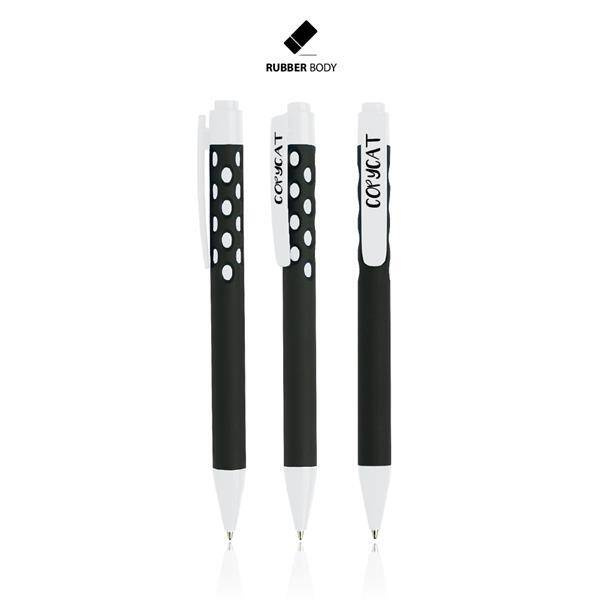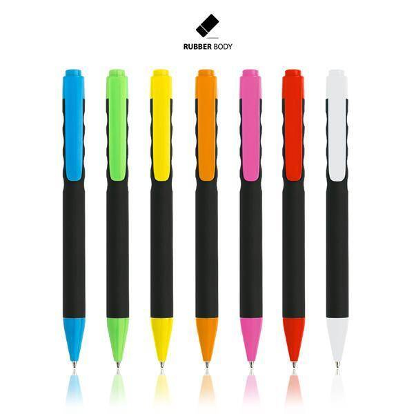 Długopis plastikowy z gumowaną powłoką, z mechanizmem wciskanym, pisze na niebiesko.