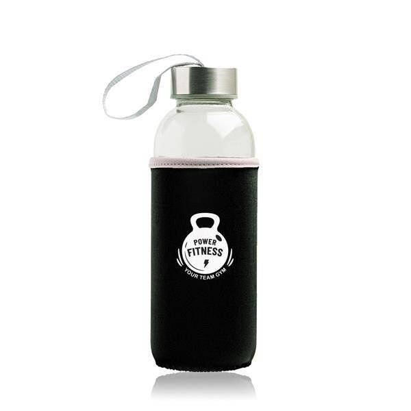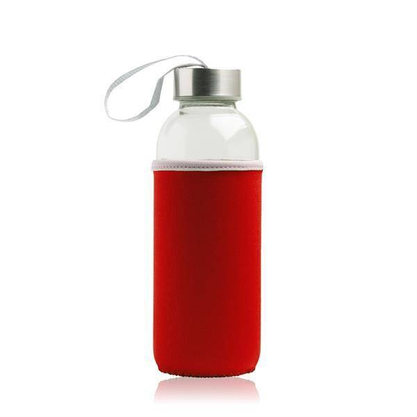 Butelka szklana w neoprenowym etui, z metalową zakrętką, pojemność 460 ml.