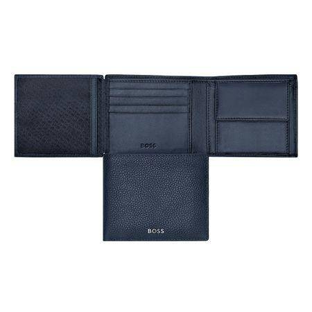 Ten składany portfel z kieszenią na monety jest wykonany ze starannie dobranej, najwyższej jakości granatowej skóry.