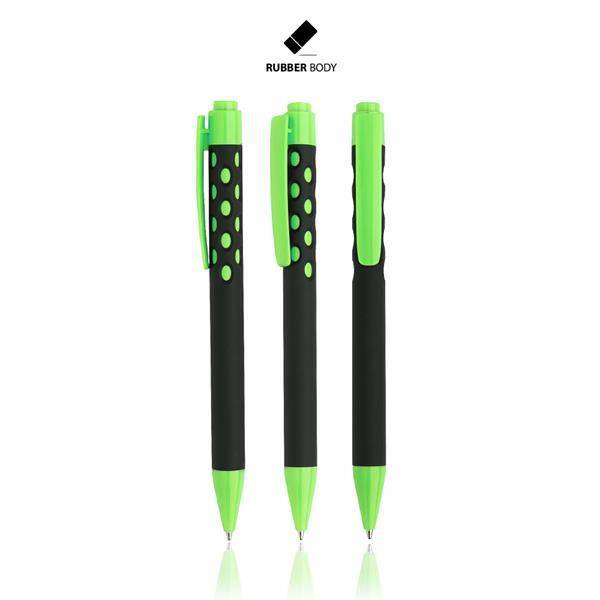Długopis plastikowy z gumowaną powłoką, z mechanizmem wciskanym, pisze na niebiesko.