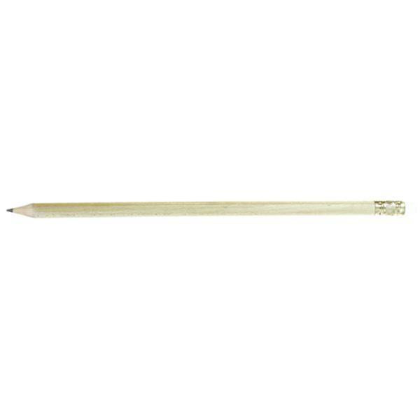 Drewniany ołówek z gumką, zatemperowany.
