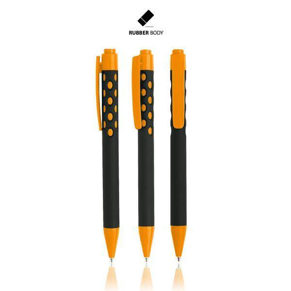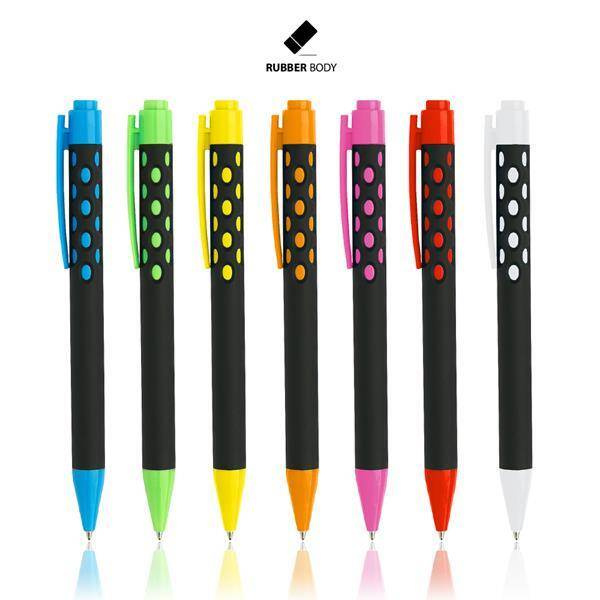 Długopis plastikowy z gumowaną powłoką, z mechanizmem wciskanym, pisze na niebiesko.