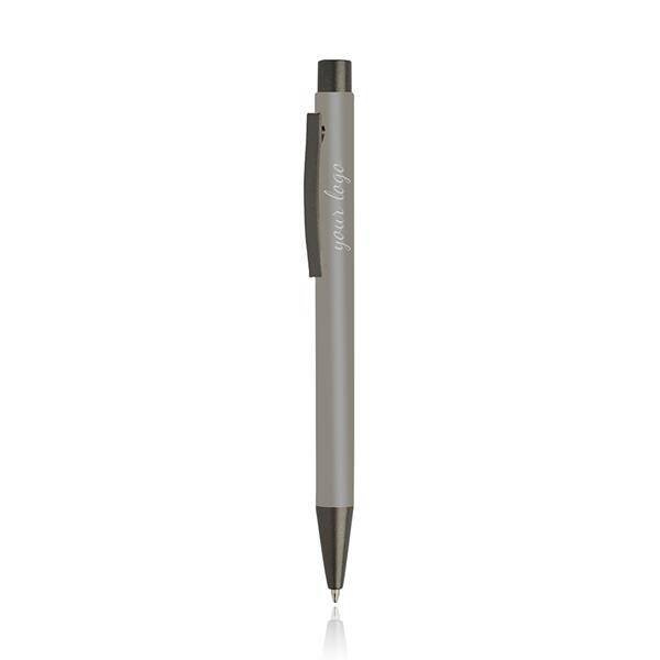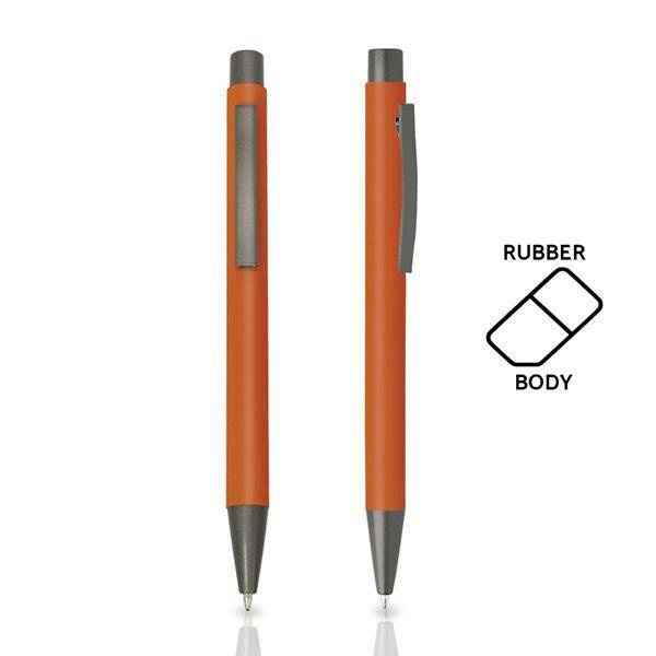 Długopis posiada aluminiowe elementy obraz korpus, pokryty gumową powłoką.
