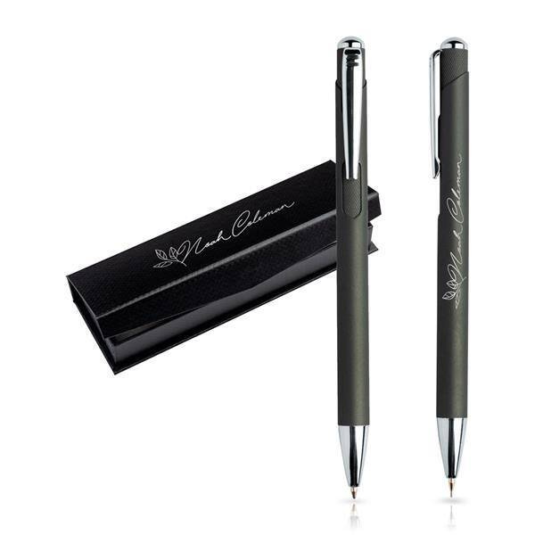 Nowoczesny zestaw piśmienniczy, składający się z długopisu oraz ołówka. Całość zapakowana w stylowe etui prezentowe z magnetycznym zamknięciem.
