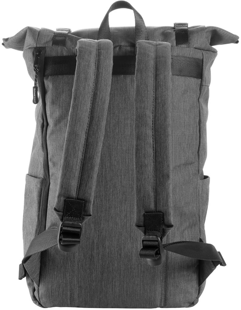 Plecak ze zwijanym zamknięciem, wyposażony w dwie frontowe kieszenie zapinane na zamek, dwie boczne kieszonki, zamek z tyłu zapewniający dostęp do dużej komory głównej, która została wydzielona na jedną dużą kieszeń oraz dwie małe - na akcesoria. Po zrolowaniu górnej części plecaka całość zamykamy dwoma paskami z plastikowymi klamerkami. Plecak posiada watowane szelki i plecy.