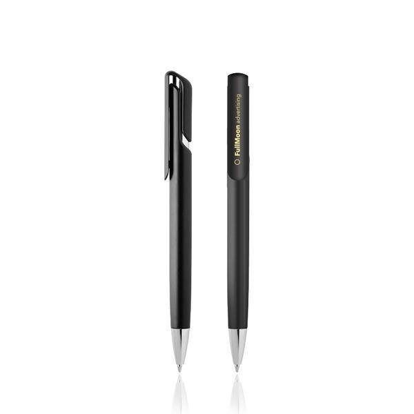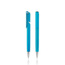 Długopis plastikowy w metalicznym kolorze, z mechanizmem wciskanym, pisze na niebiesko.