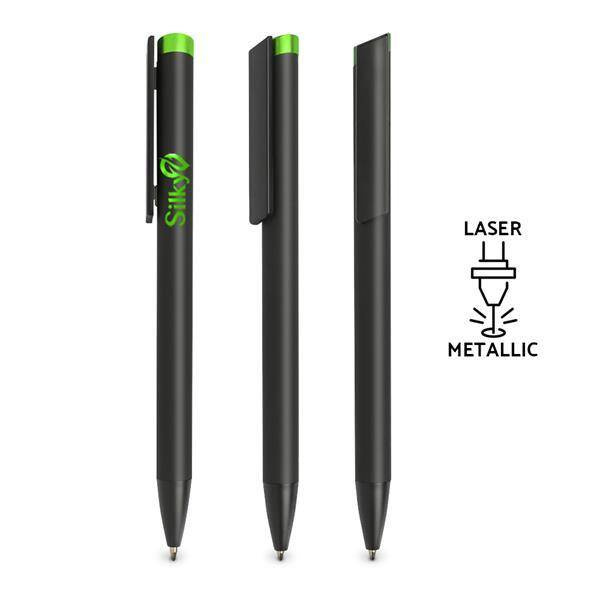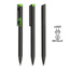 Czarny długopis z mechanizmem wciskanym z gumową, antypoślizgową powłoką, soft touch i kolorową końcówką.