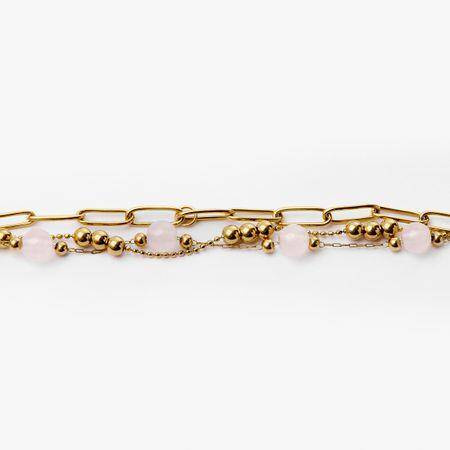 Doświadcz uroku naszej bransoletki trompe loeil `Andrea` w kolorze złotym i różowym, urzekającego elementu, który sprytnie naśladuje wiele łańcuszków i bransoletek podczas noszenia.