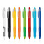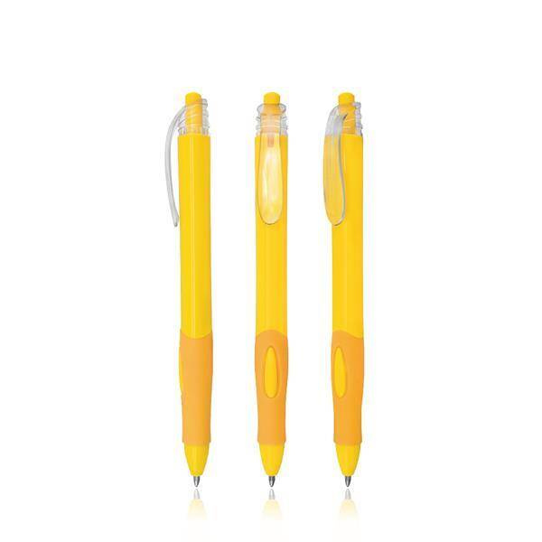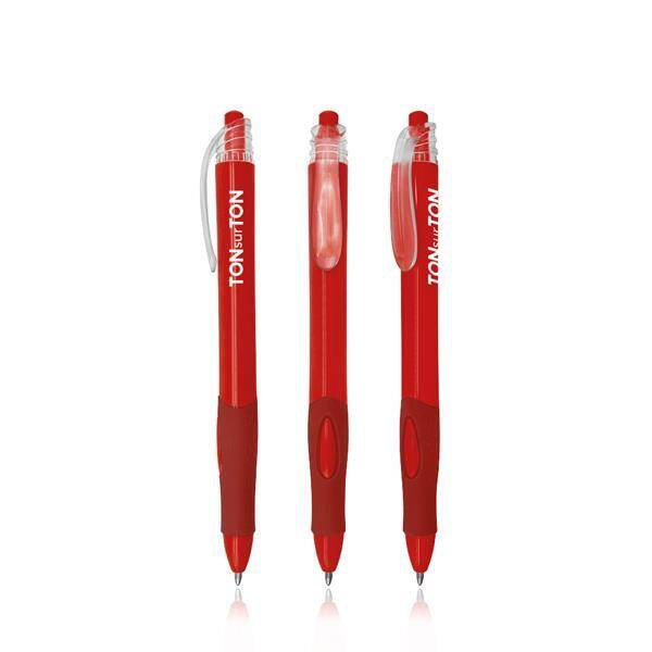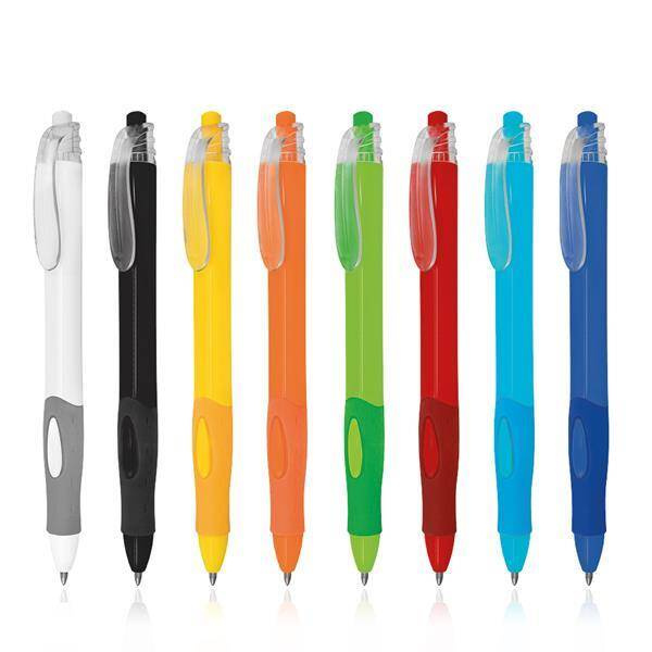 Plastikowy długopis z przezroczystym klipsem, z mechanizmem wciskanym, pisze na czarno.