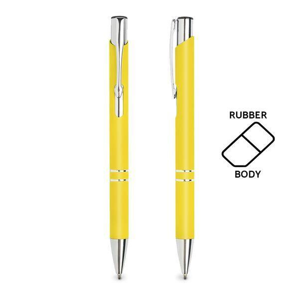 Długopis aluminiowy z gumowaną powierzchnią, soft touch oraz z mechanizmem wciskanym.