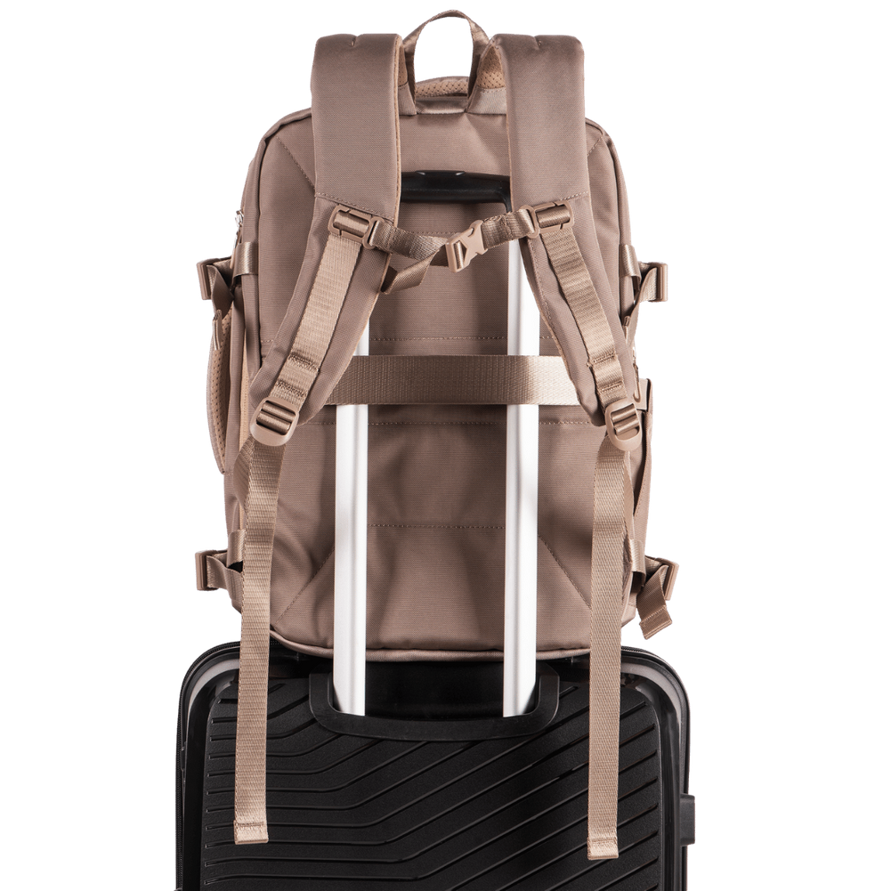 - Na walizce: za pomocą specjalnej taśmy na tylnej stronie plecaka.