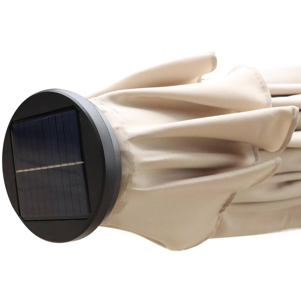 Wbudowane oświetlenie LED sprawia, że parasol może być używany również wieczorem. Daje to możliwość korzystania z ogrodu po zmroku, tworząc przyjemną, romantyczną atmosferę. Diody LED zasilane są panelem słonecznym umieszczonym na górze parasola, należy jednak pamiętać, że lampki będą prawidłowo działać tylko po naładowaniu akumulatorka w słoneczny dzień.