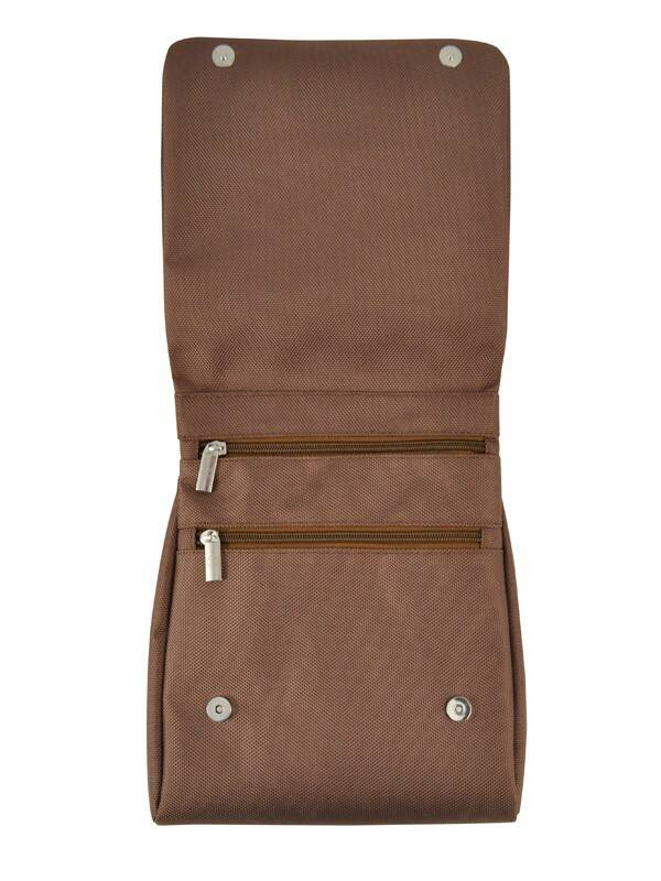 Dwie małe kieszonki na klapie, jedna zapinana na suwak z organizerem.