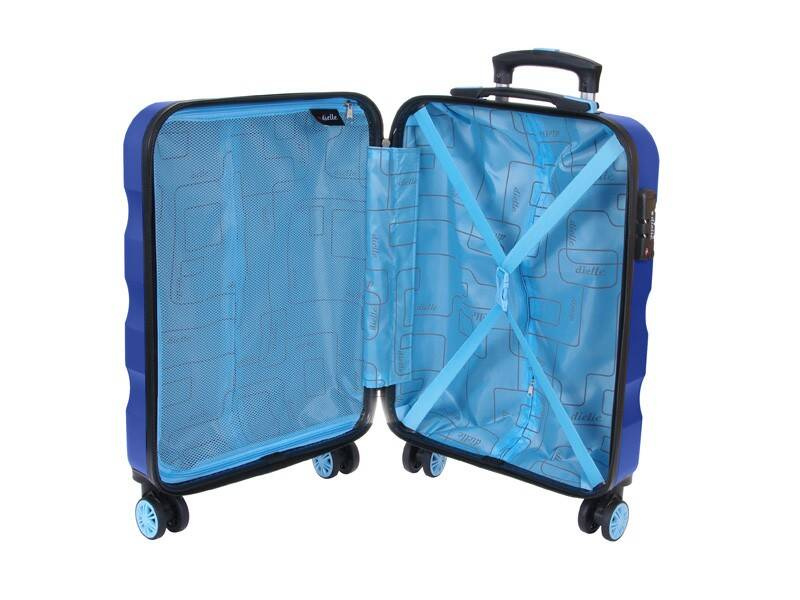 Mała walizka kabinowa włoskiej marki Dielle z kolekcji 150.  Korpus wykonany z wytrzymałego i trwałego ABS-u. Cztery podwójne obrotowe kółka gwarantują komfort przemieszczania się. Wysuwana teleskopowo , regulowana rączka stelaża. Charakterystyczne przetłoczenia walizki podkreślają niepowtarzalny wygląd tej kolekcji. Przewożoną zawartość chroni zamek szyfrowy w standardzie TSA. Wnętrze wyłożone elegancką podszewką w kontrastowym , niebieskim kolorze. Walizka charakteryzuje się wyjątkowym wyglądem oraz jakością wykonania. Wymiary walizki spełniają normy bagażu kabinowego większości linii lotniczych.