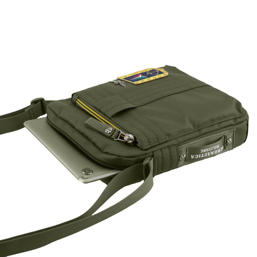 Torba na ramię, unisex, listonoszka włoskiej marki Aeronautica Militare z kolekcji Frecce. Doskonale sprawdzi się w codziennym użytkowaniu do noszenia najpotrzebniejszych rzeczy. Wykonana z tkaniny technicznej o podwyższonej odporności na przemakanie. Wyrób cechuje niepowtarzalny styl i wyjątkowe walory użytkowe.Szczegóły torby:komora główna zamykana na suwakprzednia kieszonka zamykana na suwak z dużym uchwytem, ukryta pod patką materiałuprzegroda na tabletukryta kieszeń na panelu tylnym,wewnętrzna kieszeń zamykana na suwak,wewnętrzny organizer,regulowany pasek do noszenia na ramieniu, regulowany w zakresie 80 - 150 cmpodszewka z wzorem moro wykonana z poliestruna zewnątrz z boku metalowe kółko przypięcia do małej „smyczy”metalowe detale i emblemat Włoskich Sił Powietrznych oraz wytłoczone logo marki.