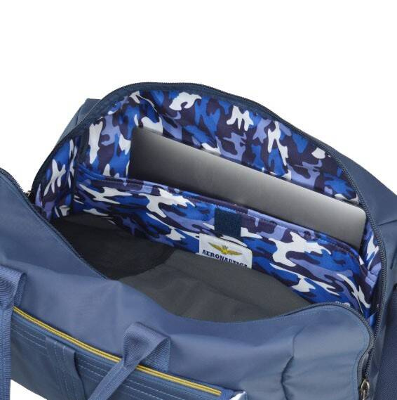Torba podróżna podręczna o pojemności 30 litrów włoskiej marki Aeronautica Militare z kolekcji Frecce. Torba, która doskonale sprawdzi się podczas krótkich wypadów, lub jako uzupełnienie większego bagażu. Wykonany ze specjalnej gumowanej tkaniny technicznej o podwyższonych parametrach odporności na przemakanie. Wyrób cechuje niepowtarzalny styl i wyjątkowe walory użytkowe.Szczegóły torby:komora główna zamykana na suwak2 duże uchwyty do przenoszenia torby w ręcewymienna zawieszka/breloczek do kluczykomora główna szeroko otwieranaduża przednia kieszeńduża kieszeń z tyłuodpinany pasek na ramię, regulowany w zakresie 80 - 150 cmwewnętrzna otwarta kieszeńpodszewka z wzorem moro, wykonana z poliestrumetalowe detale i emblemat Włoskich Sił Powietrznych oraz wytłoczone logo marki