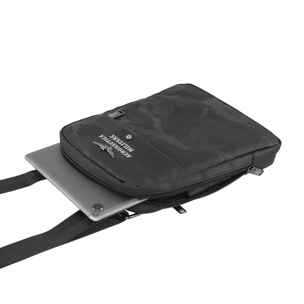 Torba na ramię, unisex typu messenger włoskiej marki Aeronautica Militare z kolekcji Camou. Doskonale sprawdzi się w codziennym użytkowaniu oraz w podróży. Wykonany ze specjalnej gumowanej tkaniny technicznej o podwyższonych parametrach odporności na przemakanie. Wyrób cechuje niepowtarzalny styl i wyjątkowe walory użytkowe. Torba z serii zainspirowanej militariami i kamuflażem.Szczegóły torby:komora główna zamykana na podwójny suwakprzegroda dedykowana na tabletregulowany pasek do noszenia na ramieniukieszeń z tyłu zamykana na suwakpodszewka z wzorem moro, wykonana z poliestrumetalowe detale i emblemat Włoskich Sił Powietrznych oraz wytłoczone logo marki