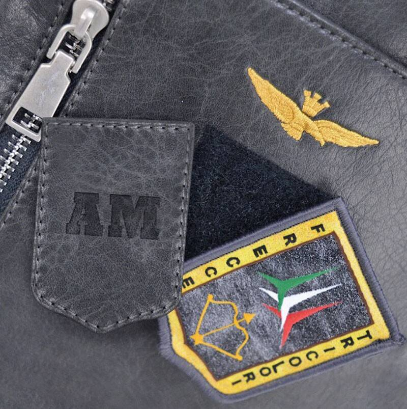 Kieszenie zamykane na suwak. Przód torby zdobią wymienne naszywki na rzep oraz charakterystyczne naszywki z logo Aeronautica Militare Frecce Tricolori.