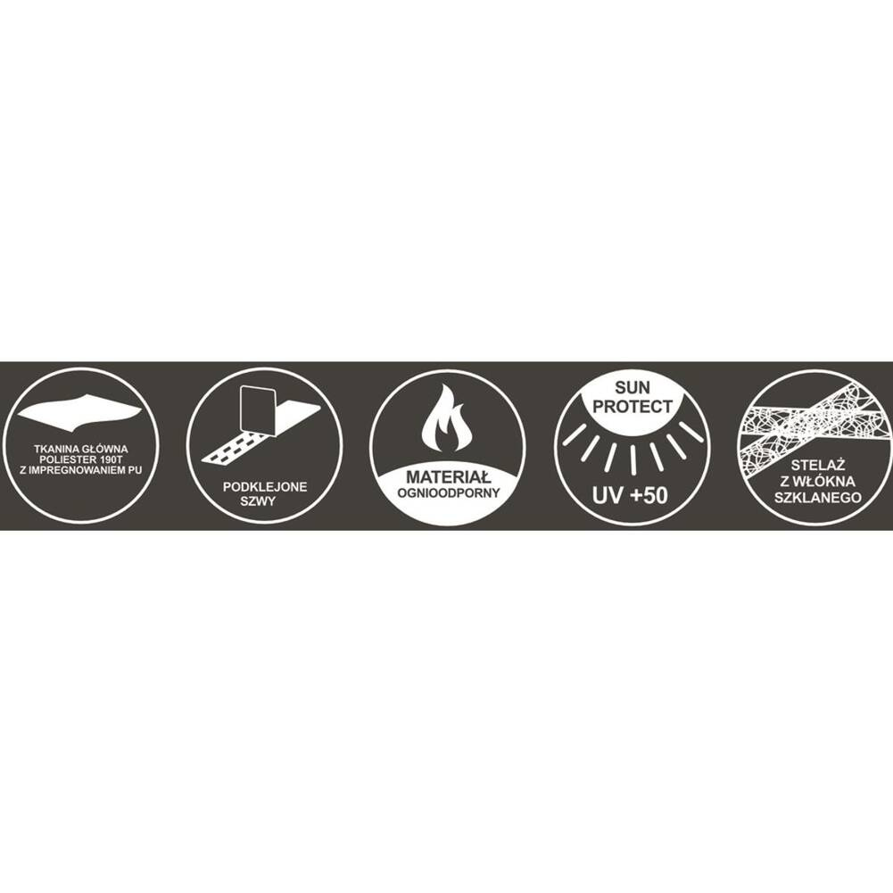 - Materiał: poliester 190 T z impregnowaniem PU, włókno szklane 7.9/6.9mm, podłoga PE 120 g/m2