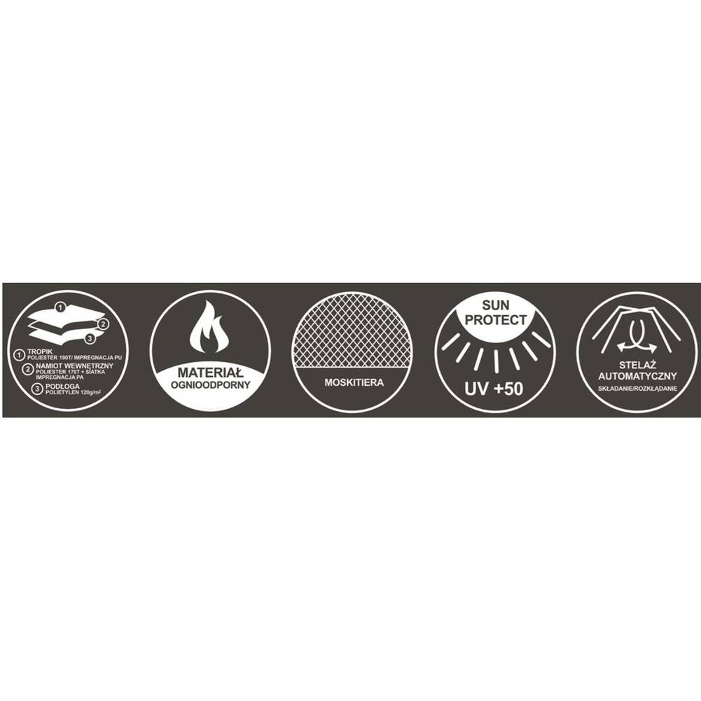 - Materiał: tropik poliester 190T z impregnacją PU, materiał namiotu poliester 170 T zaimpregnowany PA + moskitiera poliester, podłoga Polietylen 120 g/m2, stelaż włókno szklane i tworzywo sztuczne