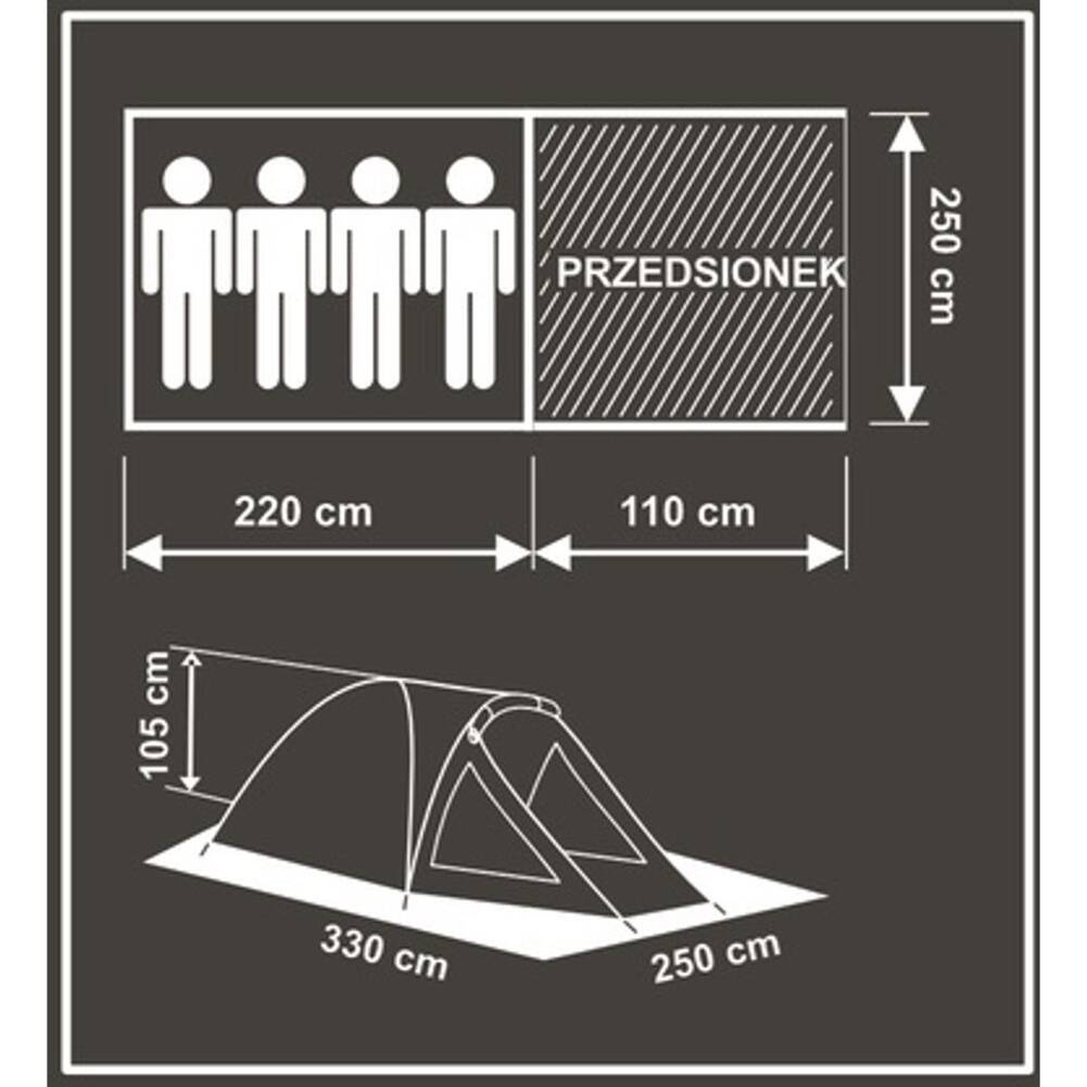 • Wymiary zew. ok.: 250 x 330 x 105 cm (szer. x dł. namiotu + przedsionek x wys.)