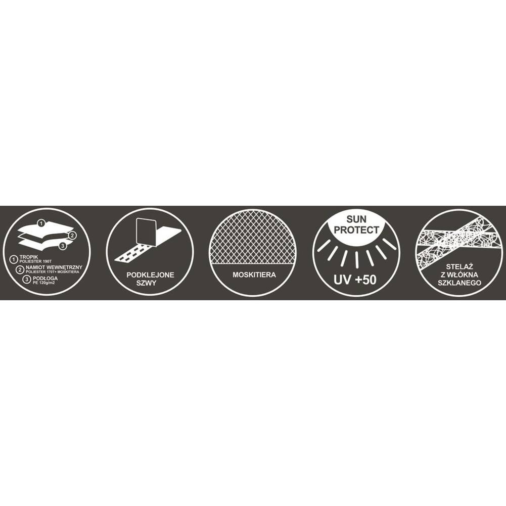 • Materiał: materiał wewnętrzny (sypialnia) poliester 170 T z siatką i moskitierą, stelaż włókno szklane 2X8.5mm /1x7.9mm, podłoga PE 120 g/m2, tropik 190T poliester wzmocniony PU