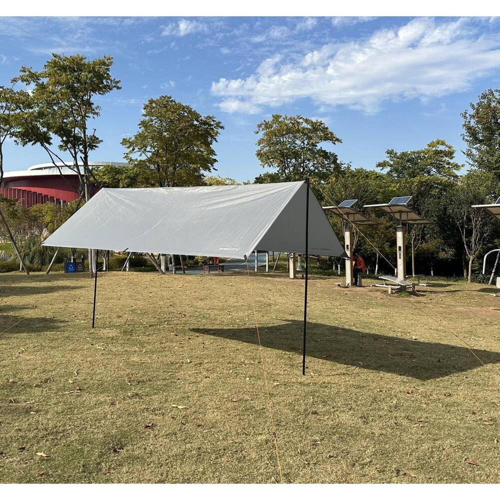 Dołączone do namiotu metalowe słupki i linki naprężające ze śledziami pozwolą rozłożyć żagiel w dowolnym miejscu i użyć w dowolnym celu.