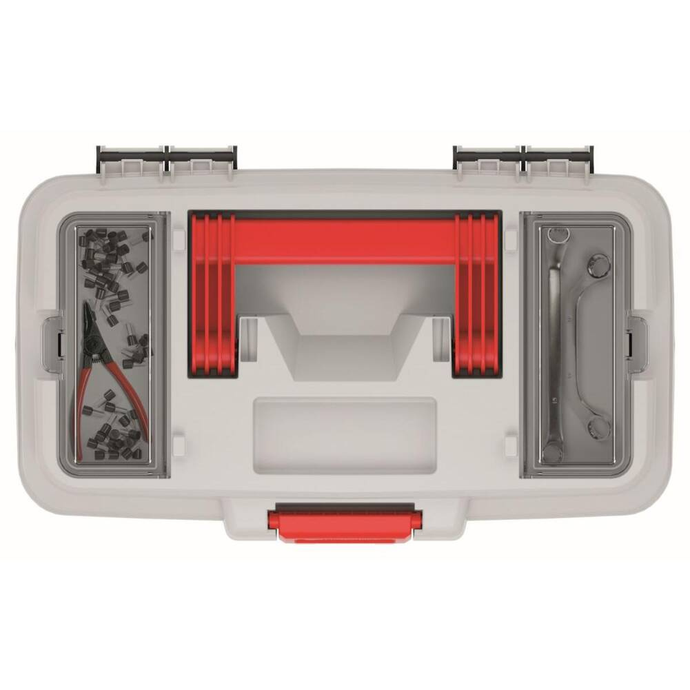 Skrzynka posiada specjalny wkład – nosidło narzędziowe z miejscem na bity, oraz dwa organizery z przeźroczystymi pokrywkami, które dodatkowo zadbają o ład i porządek, pozwolą trzymać najważniejsze narzędzia w jednym miejscu.
