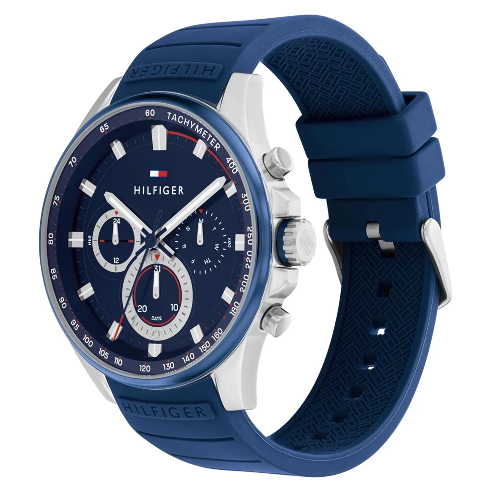 Zegarek męski TOMMY HILFIGER MAX 1791970 to nowoczesny i elegancki model do noszenia na co dzień. Koperta wykonana z wysokiej klasy stali szlachetnej 316L, odpornej na korozję oraz hipoalergicznej w kolorze srebrnym. Na granatowej tarczy, ze szlifem słonecznym znajdują się subtarcze wskazujące: dzień miesiąca, dzień tygodnia oraz czas 24 godzinny. Pasek wykonany z z gumy w kolorze granatowym. Całość chroniona szkłem mineralnym.