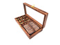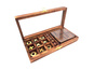 topem, mosiężne zamknięcie, przegródki do przechowywania gier • W zestawie znajdują się gry: Domino, Kości do gry, Kółko i krzyżyk