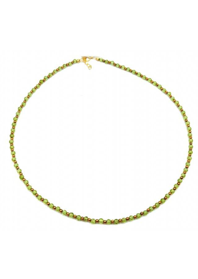 Naszyjnik wykonana ze srebra próby 925, pozłacanego 24 karatowym złotem. Kamień: Oliwin + Hematyt Rozmiar kamienia: 3/2 mm Długość: 42 cm Długości do wyboru: