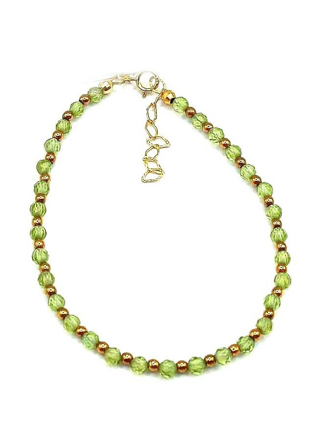 Bransoletka wykonana ze srebra próby 925,złoconego 24 karatowym, żółtym złotem Kamień: Oliwin+ Hematyt Rozmiar kamienia: 3/2 mm Długość: 17,5 cm