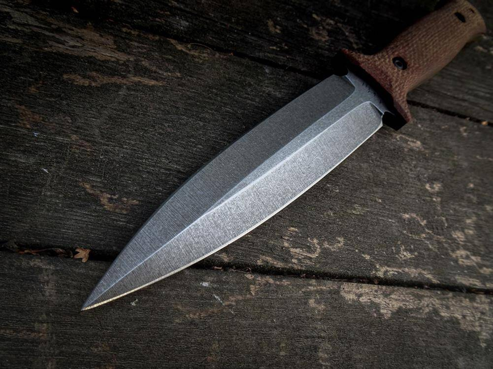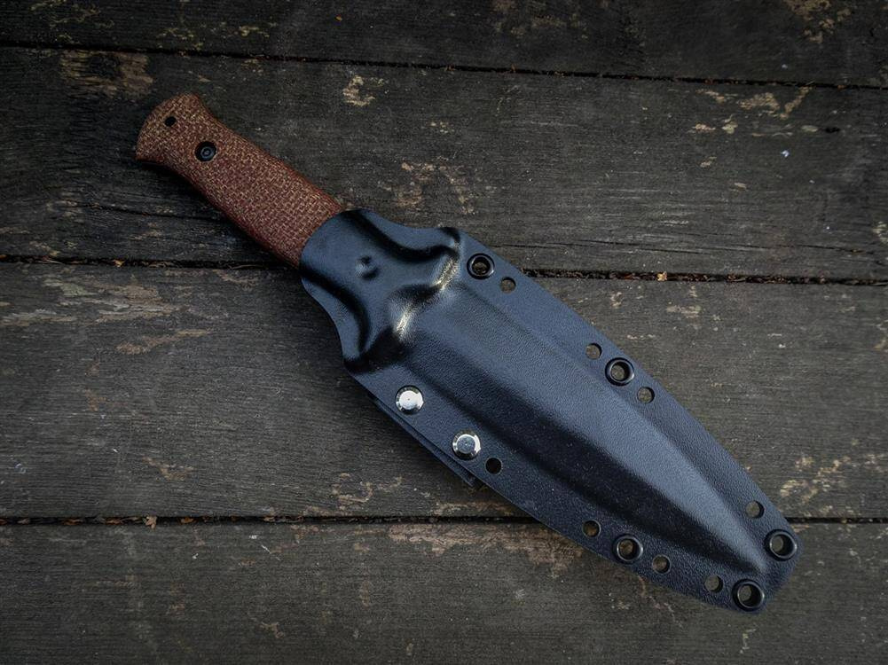 Stal klingi O2 Bohler K720 - 59 HRC, długość całkowita 254 mm, długość klingi 130 mm, grubość klingi 4.4 mm, szerokość klingi 32 mm, waga 201 g, rękojeść Micarta, w komplecie pochwa z kydexu.