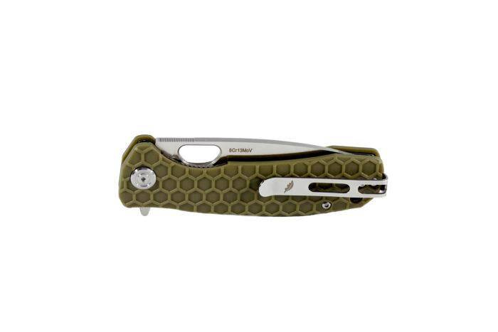 Szczególnie imponująca w Honey Badger Flipper Large jest jego trwała konstrukcja. Stal 8Cr13MoV jest niezwykle wytrzymała i łatwa do ostrzenia. Gruby trzon i szeroki profil z pełnym szlifem płaskim zapewniają stabilność i ułatwiają cięcie. Wysokiej jakości przegub z łożyskiem kulkowym umożliwia płynne otwieranie i zamykanie satynowego ostrza za pomocą kciuka. Wzór plastra miodu na teksturowanej, oliwkowozielonej łusce z FRN zapewnia pewny chwyt. Z otworem na smycz i odwracalnym, głębokim klipsem (tip-up / l-r).