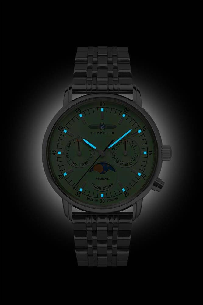 Ronda 706.1, tarcza zielona, wskazówki i indeksy z Super-LumiNowa, szkło mineralne K1, koperta stalowa, dekiel stalowy, średnica 36 mm, wysokość 10 mm, fazy księżyca, rozszerzony datownik, bransoleta stalowa, WR 5 ATM
