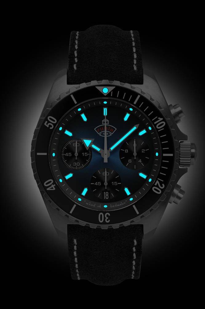 Miyota 6S20, tarcza niebieska, indeksy i wskazówki srebrne, Super-LumiNova na indeksach i wskazówkach, szkło szafirowe, dekiel stalowy, koperta ze stali nierdzewnej, średnica 43 mm, wysokość 14 mm, WR 20 ATM, pasek skórzany, chronograf, datownik, obrotowy bezel