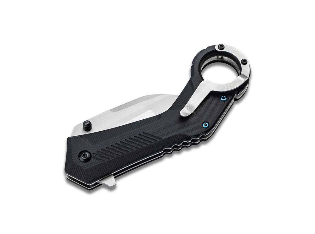 Szybko, szybciej, Veloc! Boker wzmacnia Magnum Veloc i wyposaża nóż Karambit w mechanizm otwierania wspomagany sprężyną. Flipper lub opcjonalny kołek pod kciuk otwierają agresywne ostrze 440B Wharncliffe z wykończeniem typu beadblast przy niezbędnym tylnym wietrze, podczas gdy blokada linerlock niezawodnie blokuje wspomagany otwieracz na miejscu. Wygięta rękojeść z teksturowanymi skalami G10 zapewnia doskonały chwyt i kończy się charakterystycznym pierścieniem na końcu rękojeści, który pierwotnie służył do mocowania noża na małym palcu, ale służy również jako otwór na smycz. Anodowane na niebiesko elementy, takie jak pierścień wzdłuż śruby obrotowej i śruby uchwytu, dodają nowoczesnych akcentów klasycznemu kształtowi noża z Azji Południowo-Wschodniej. Z klipsem do podnoszenia (r).
