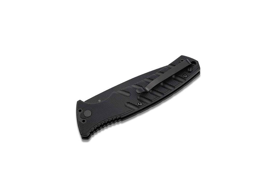 W pełni rozwinięty Boker Plus Strike Large uzupełnia szeroką gamę noży automatycznych jako solidny nóż sprężynowy do codziennego użytku lub użytku. Smukła, ergonomicznie ukształtowana rękojeść opiera się na solidnych stalowych płytkach, które są wyposażone w skale wyfrezowane z czarnego Grivory dla dobrego chwytu. Nowoczesne tworzywa sztuczne charakteryzują się bezkompromisową wytrzymałością i wysoką odpornością w połączeniu z niską wagą. Głębokie rowki z wyraźnym wgłębieniem na kciuk również zapewniają bezpieczną obsługę. Dzięki łatwo zamykającemu się przesuwnemu urządzeniu zabezpieczającemu można również zablokować zamknięty nóż i zapobiec przypadkowemu uruchomieniu. Naciśnięcie przycisku blokady zwalnia ostrze; napięcie sprężyny znajdującej się za nim otwiera je automatycznie. Ostrze typu drop point wykonane jest z D2 i pokryte czarną powłoką proszkową, aby dopełnić taktyczny wygląd. Z tyłu znajduje się dwustronny klips (przechylanie do góry/odwracanie), a otwór na smycz dodatkowo zwiększa możliwości noszenia. Z wysokiej jakości nylonowym etui do przechowywania.