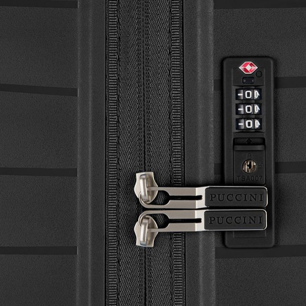 - dodatkowo wyposażona w wbudowany do wnętrza walizki zamek szyfrowy TSA (Travel Security Agency, bardzo przydatny w podróżach do USA)