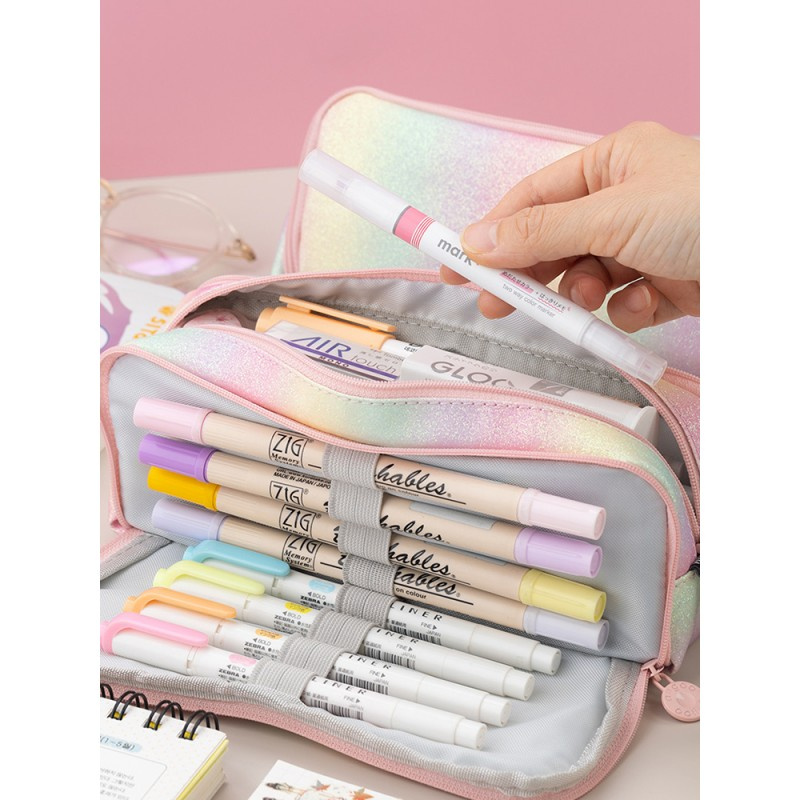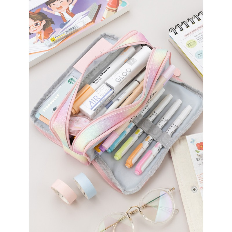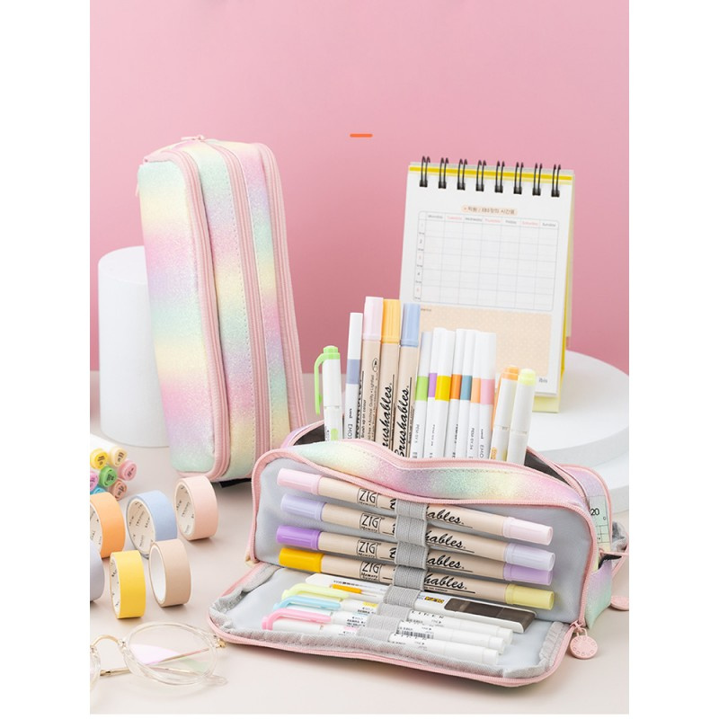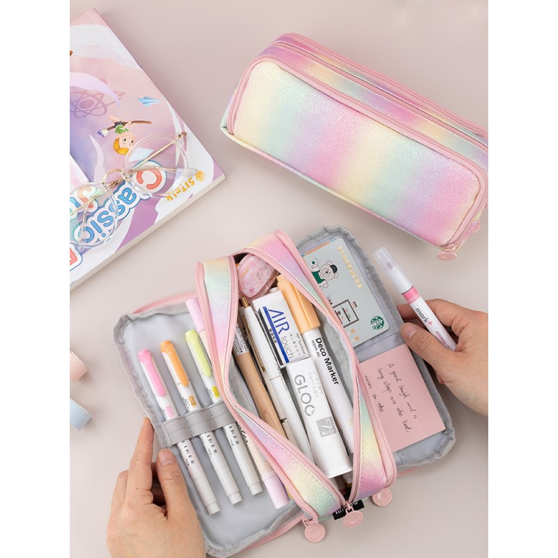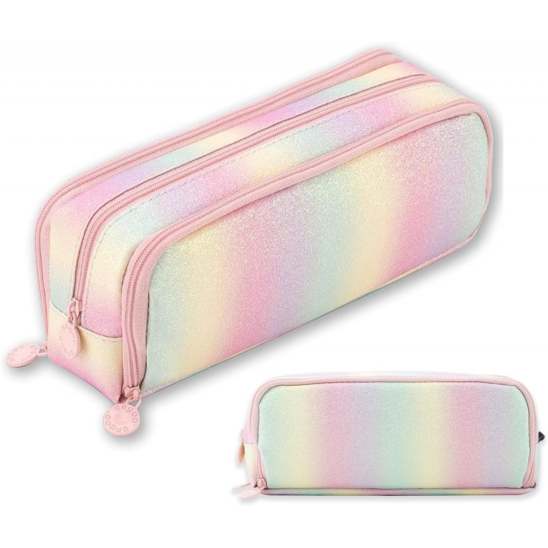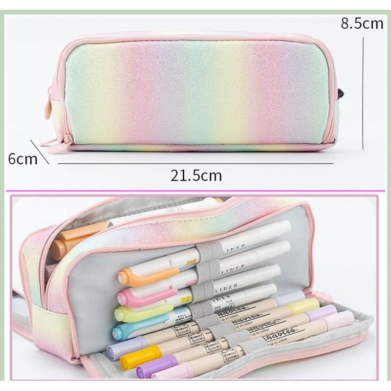 DUŻY PIÓRNIK WIELOFUNKCYJNY SASZETKA TRZYKOMOROWY Pojemny, wielofunkcyjny trzykomorowy piórnik Wykonany z wysokiej jakości materiałów. Ergonomiczne wykorzystanie przestrzeni. Specyfikacje: Kolor: tęczowy brokatowy Materiał: 100% poliester Wymiary: 22 cm  x 8 cm x 9 cm Waga: 105g