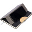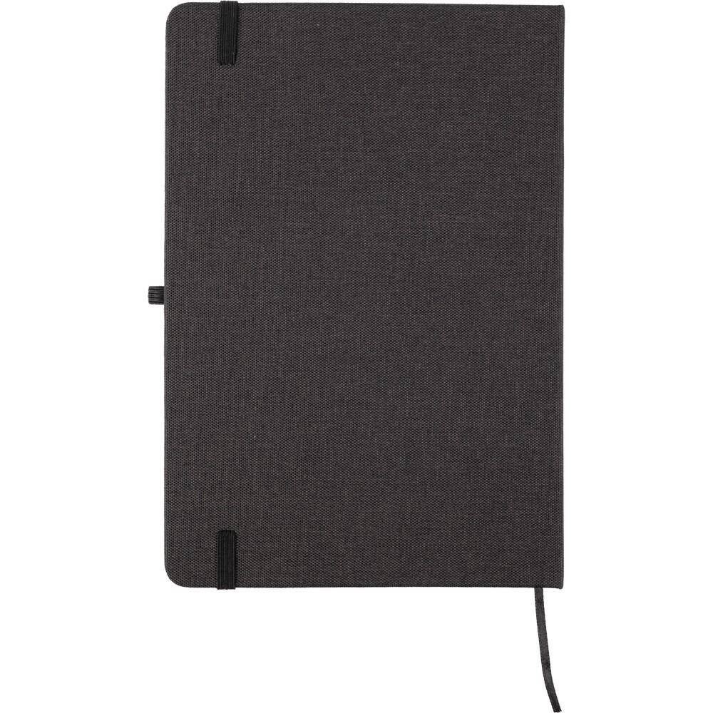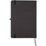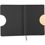 Notatnik ok. A5, posiada 80 stron w linie, tasiemka zakładkowa umożliwia wygodne zaznaczanie ostatniej strony lub ważniejszych notatek, dodatkowe zamknięcie w postaci dopasowanej kolorystycznie elastycznej opaski, składana okładka z bambusowym elementem zmienia się w stojak na telefon, zmieści się do szkolnego plecaka, produkt wykonany z RPET