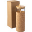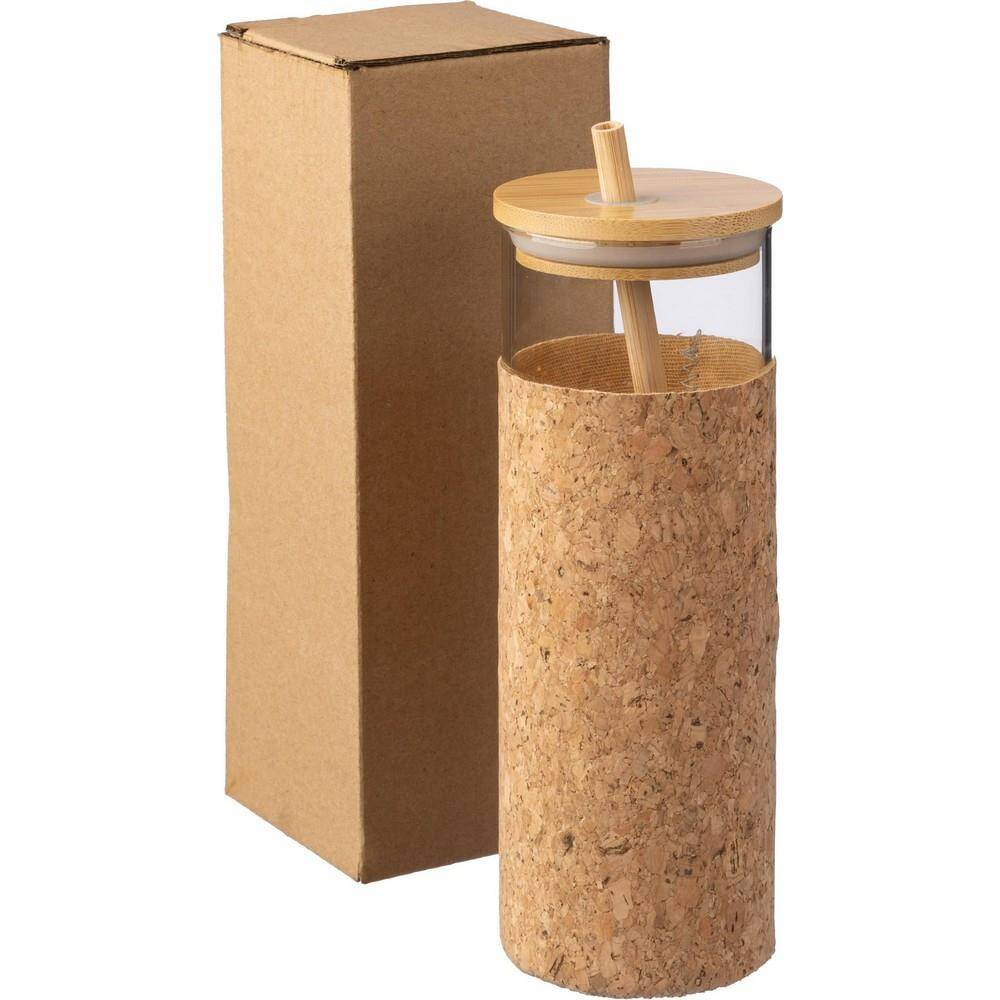 Kubek podróżny 450 ml, pojedyncza ścianka ze szkła borokrzemowego otoczona korkową obudową, nadaje się do zimnych i ciepłych napojów, w komplecie słomka ułatwiająca picie oraz wieczko wykonane z bambusa