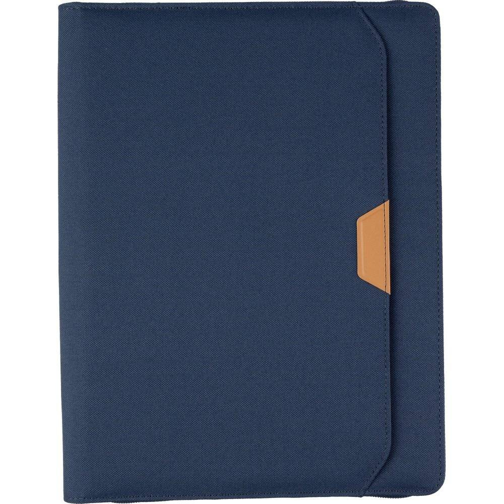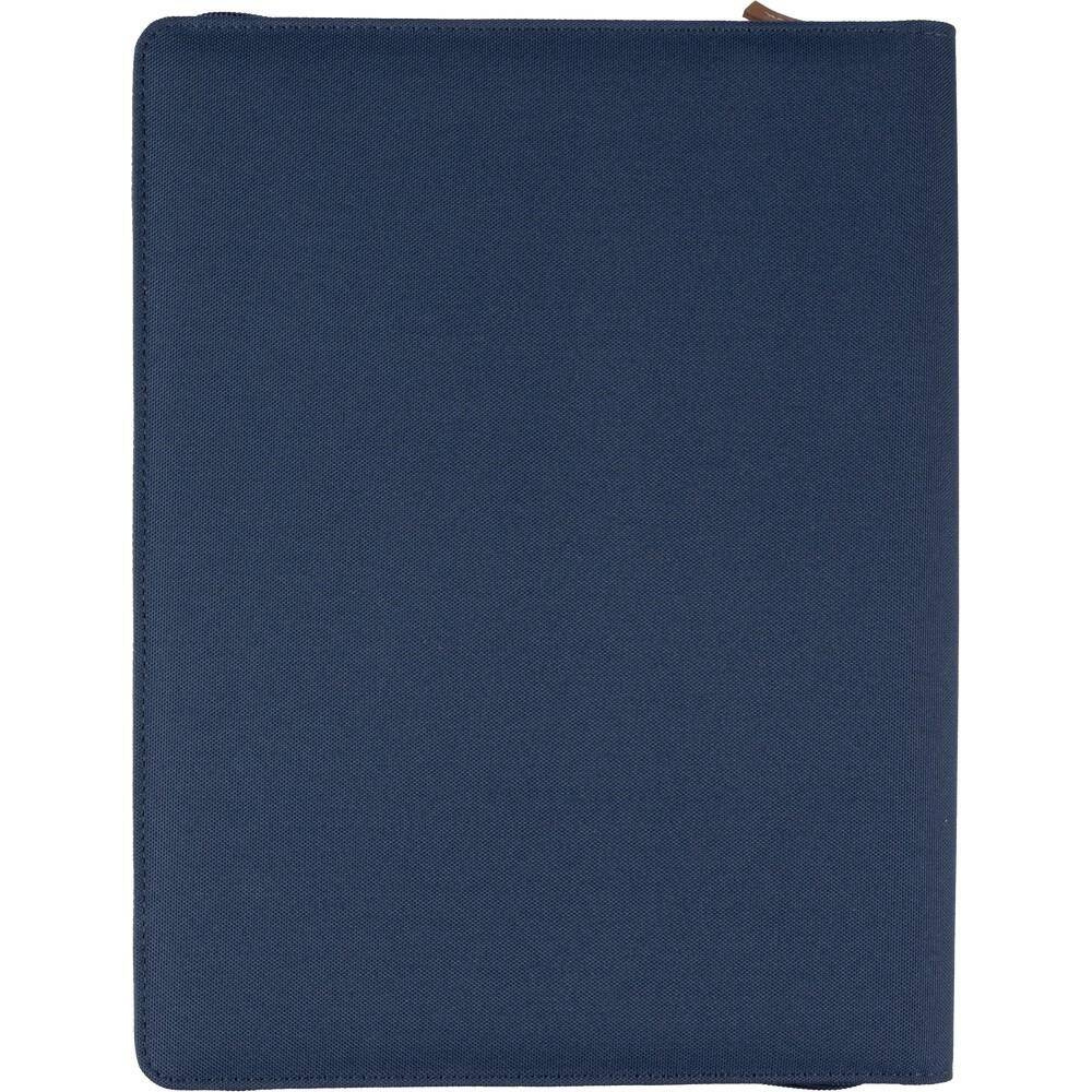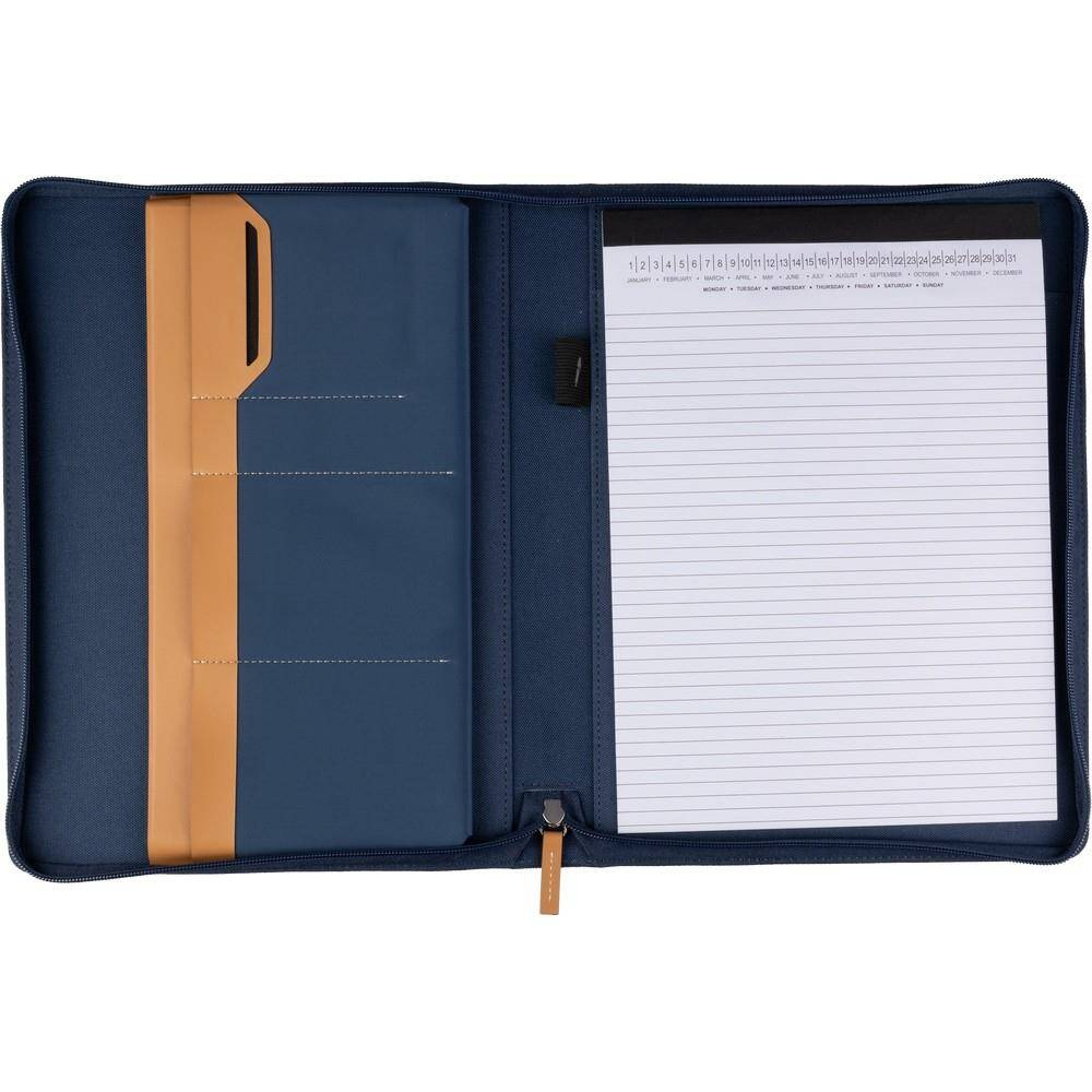 Teczka konferencyjna w formacie ok. A4, posiada 20 kartek w linie, przegródki na dokumenty, pętelka na długopis, mała przednia kieszeń, pakowane pojedynczo w brązowe kraftowe pudełko, produkt wykonany z RPET