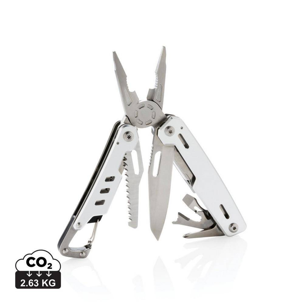 Trwałe i wytrzymałe narzędzie wielofunkcyjne, wykonane ze stali nierdzewnej, aluminiowy uchwyt, 11 funkcji: szczypce, kombinerki, przecinak do kabli i drutu, nóż, śrubokręt krzyżakowy, śrubokręt płaski, piła, otwieracz do puszek, otwieracz do butelek, urządzenie do usuwania izolacji z kabli, karabińczyk, w ozdobnym pudełku, ślad węglowy produktu: 2,63 kg CO2