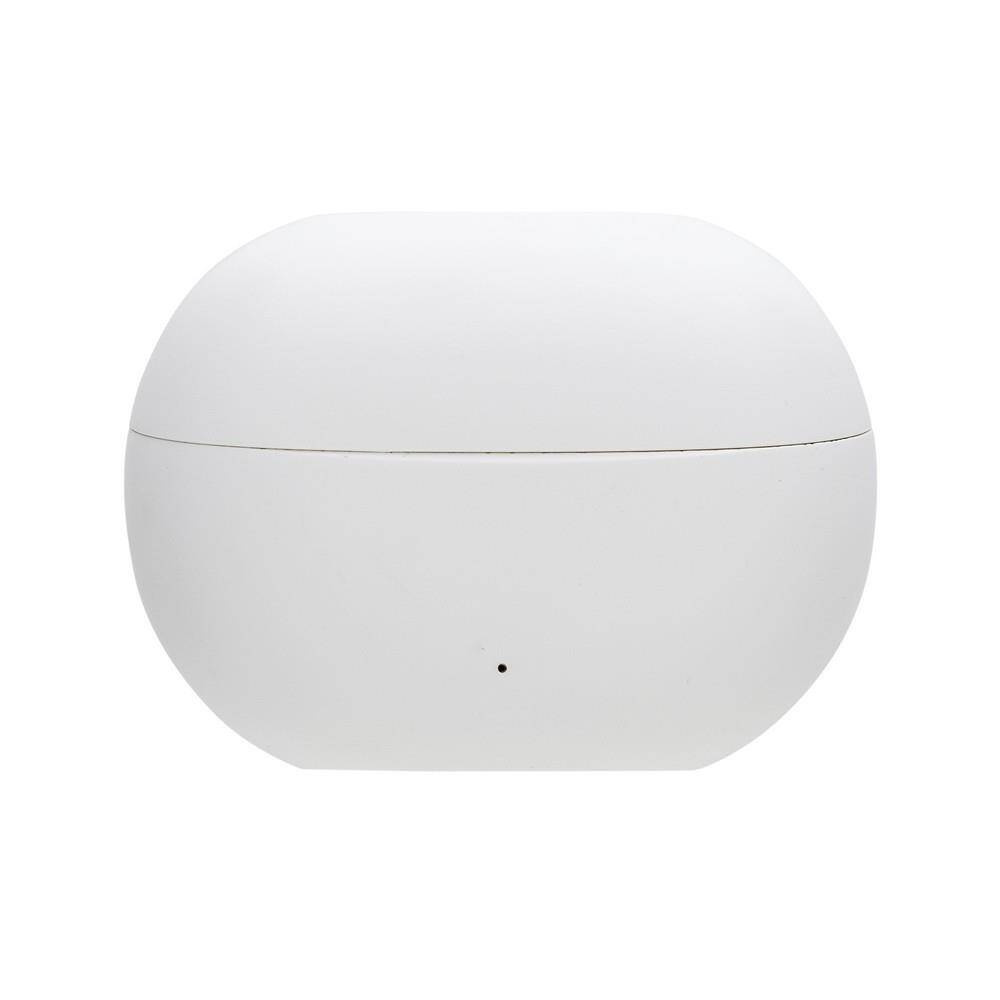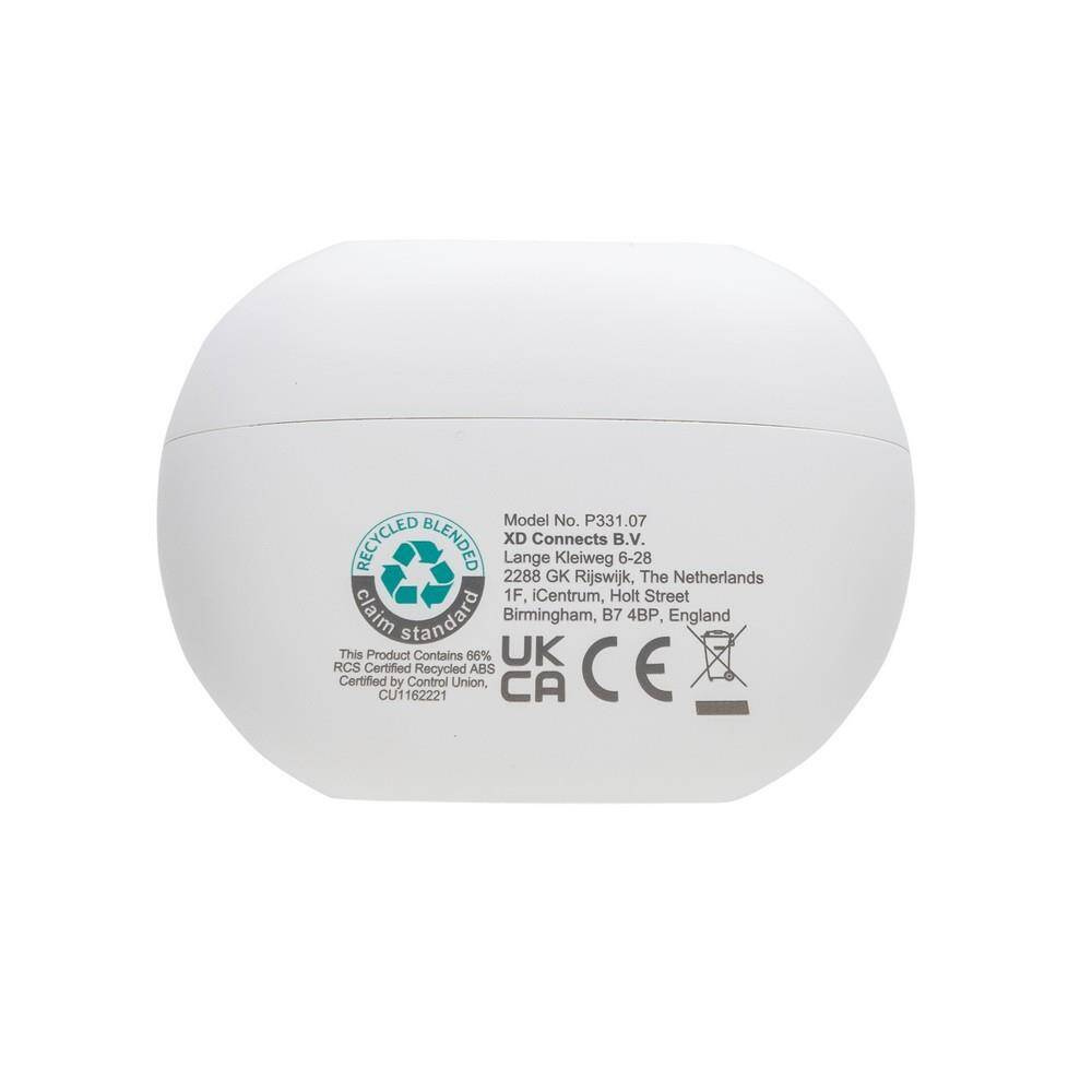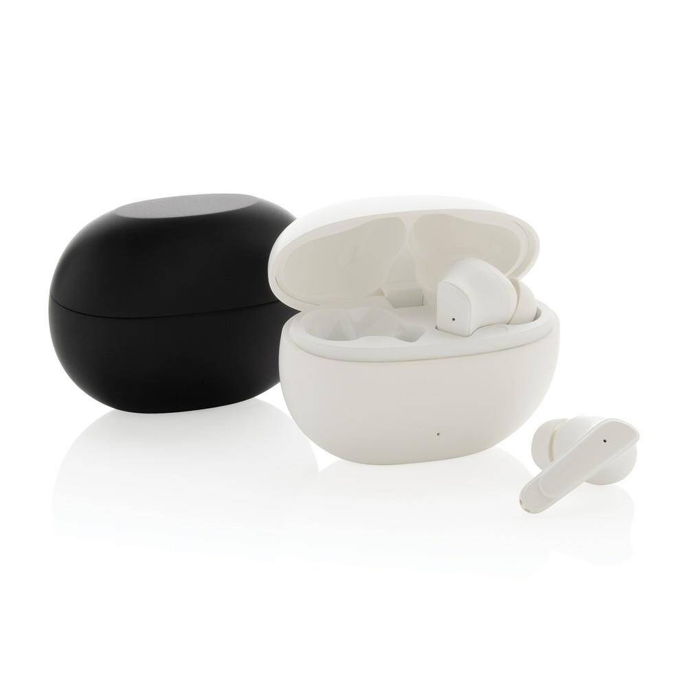 Bezprzewodowe słuchawki duszne, BT 5.3, posiadają funkcje ANC (do 23dB) i ENC, wykonane z ABS z recyklingu z certyfikatem RCS, wbudowany mikrofon, funkcja odbierania połączeń, etui z akumulatorem 200 mAh pełniące funkcję stacji ładującej w komplecie, akumulator słuchawek o pojemności 30 mAh umożliwia odtwarzanie muzyki na średnim poziomie głośności do 5 godzin z ANC lub do 7 godzin bez ANC, ponowne naładowanie za pomocą etui w 1,5 godziny, zasięg do 10 m, 3 rozmiary nakładek dousznych w komplecie, całkowita zawartość materiałów z recyklingu obliczona na podstawie wagi całkowitej produktu: 66%