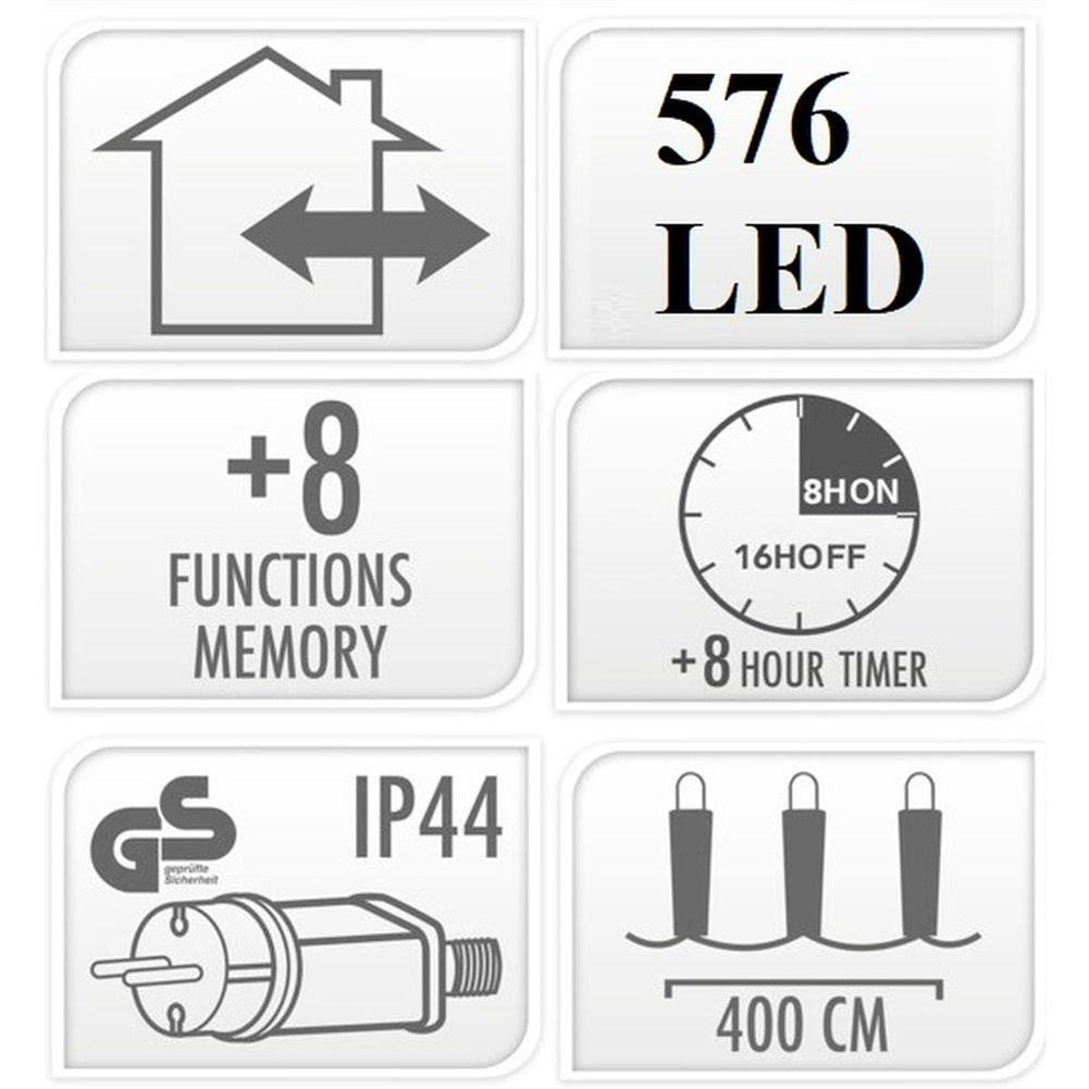 Ten łańcuch świelny ma aż 576 gęsto ułożnych bo, co 55 mm diod LED, dzięki temu gwarantuje wspaniały efekt świetlny, który na pewno przyciągnie wzrok i sprawi, że wokół zapanuje wspaniały, świąteczny klimat.