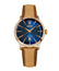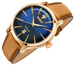Ten zegarek to prawdziwe połączenie miedzianych tonów z głębokim granatem, które definiuje nowoczesną elegancję. Miedziana koperta oraz wysokiej jakości brązowy skózany pasek nadają mu luksusowego i ciepłego charakteru, wyróżniając się na tle innych modelów. Metaliczna, niebieska tarcza wprowadza do zegarka nutę dynamiki i tajemniczość, a wyjątkowe wykończenie sprawia, że zegarek prezentuje się doskonale zarówno w blasku słońca, jak i przy sztucznym świetle. Odbijając światło, tarcza staje się prawdziwie hipnotyzująca.
