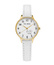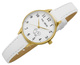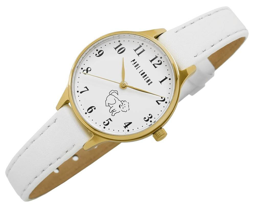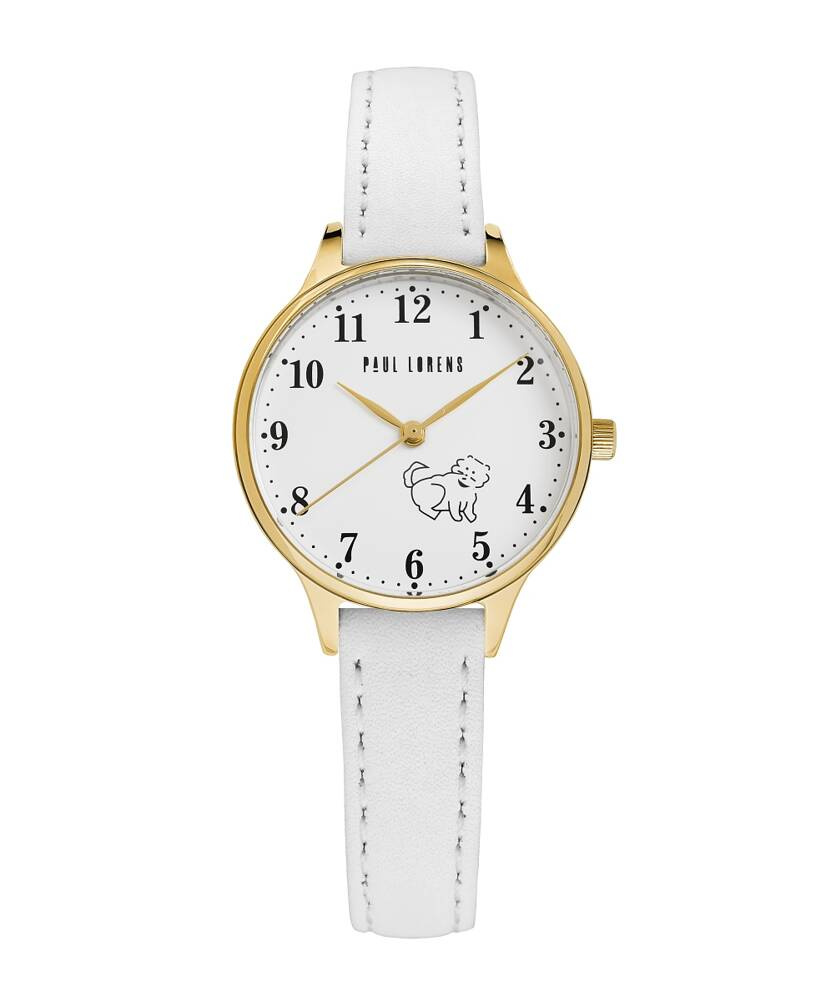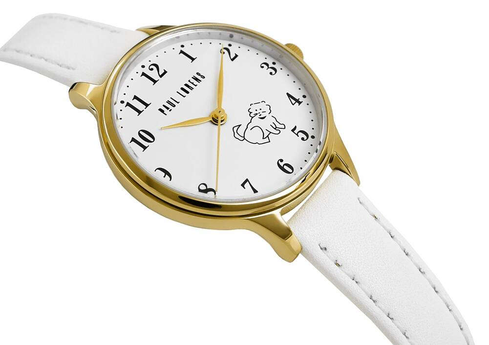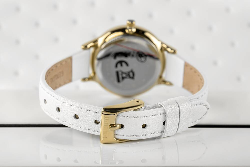ZŁota koperta harmonijnie współgra z białą tarczą, na której widnieje uroczy wizerunek pieska, dodając zegarkowi radosnego charakteru. Ta subtelna grafika sprawia, że zegarek staje się wyjątkowym, osobistym akcesorium, które maluch będzie nosił z dumą. Złote wskazówki i indeksy dodają elegancji, a sprytnie zaprojektowany sekundnik, poruszający się z gracją, uczyni naukę odczytywania czasu przyjemnością i ekscytującą przygodą.