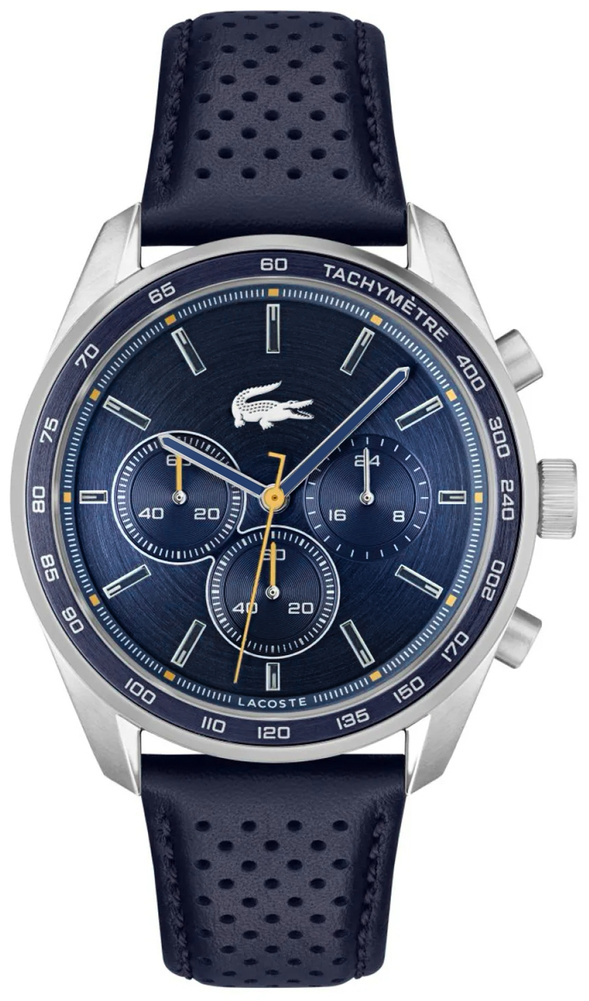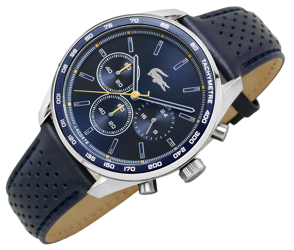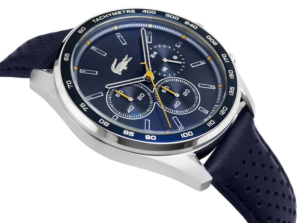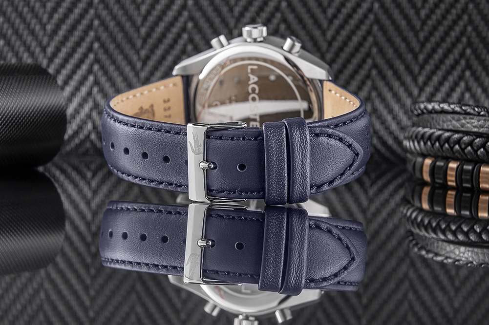 Srebrna koperta, mocna i wyrazista, otula tarczę w głębokim, metalicznym granacie, jakby prosto z morskiej toni – elegancja i dynamika w jednym. Indeksy i wskazówki, utrzymane w chłodnym połączeniu srebra z granatem, emanują precyzją i pewnością. A sekundnik? Ten pomarańczowy detal to prawdziwy manifest – odwaga i energia, które pchają do działania. Na nadgarstku spoczywa pasek z perforowanego, granatowego skórzanego materiału, solidny i stylowy, zapinany na srebrną sprzączkę, która wieńczy ten zestaw niczym perfekcyjnie dobrana klamra w dobrze skrojonym garniturze. A srebrna koronka to symbol kontroli nad czasem – dla faceta, który nie pozwala, by czas nim rządził. Delikatne logo Lacoste znajduje się w górnej części tarczy, subtelnie przypominając o prestiżowej marce, bez dominowania nad resztą projektu.