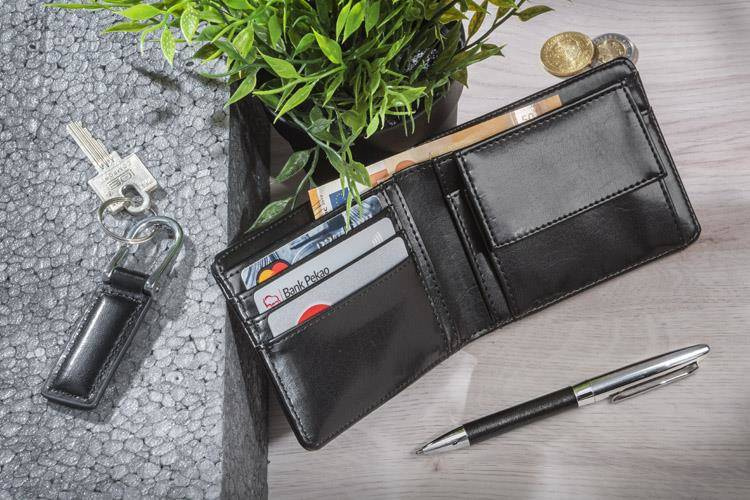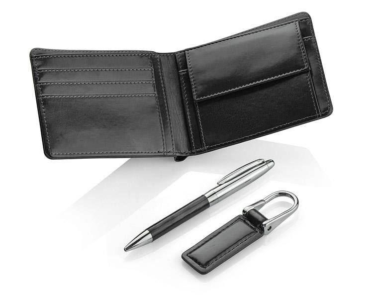 - Komplet upominkowy zawierający portfel, brelok oraz metalowy długopis.